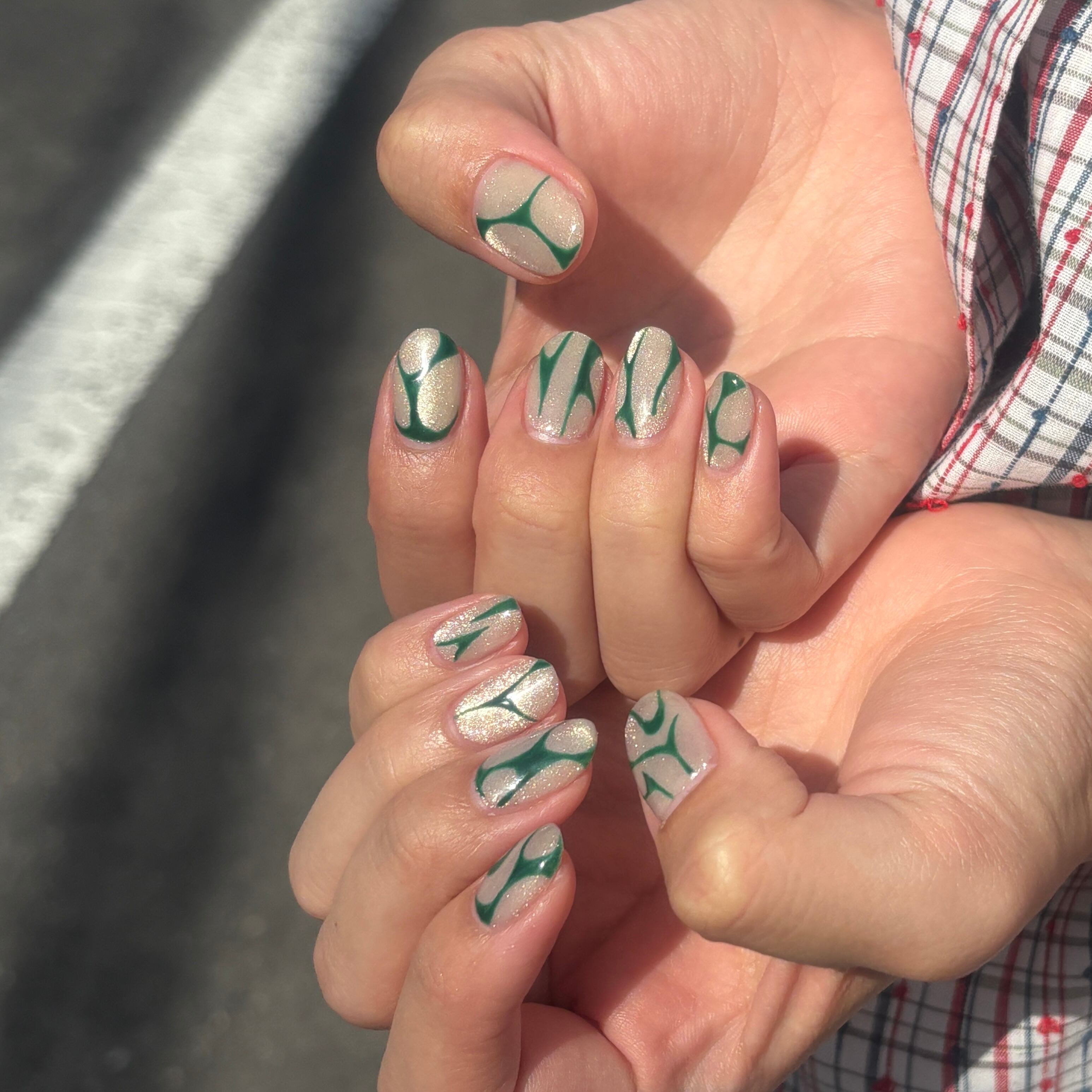 肌なじみのよいシャンパンベージュをベースに、みどり流線が描かれたニュアンスネイル。